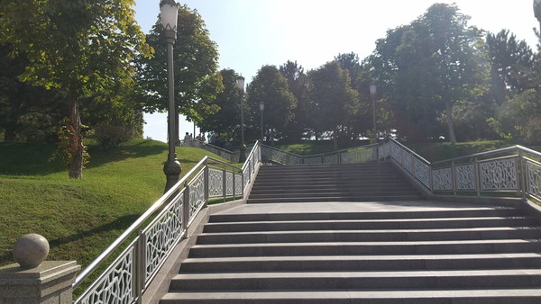 昨日歩いたレギスタン通りの遊歩道と同様、カリモフ通りも緑豊かに手入れがされており、青空との調和も見事で歩いているだけでテンションが上がってきます。