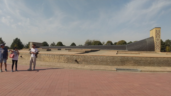 駐車場の先にある、横幅のある階段を登ると、途中に広場のようなスペースがあり、中央にはウルグ・ベクの銅像が置かれていました。これまでも何度か登場した第4代君主ウルグ・ベクの銅像であり、この天文台は彼により建てられました。ティムールの孫に当たる彼ですが、開明的な統治者だっただけでなく、彼自身が優れた天文学者・数学者・文人でした。