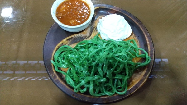お目当ては、ホレムズ地方の伝統料理である「シヴィット・オシュ」で、これだけだと足りなそうだったので「牛肉と玉葱」も注文しました。飲み物はアイスティーにしました。値段は順番に、55,000スム(約700円)、90,000スム(約1,000円)、35,000スム(約400)と、他のお店に比べて若干高めの値段設定です。「シュヴォイト・オシュ」は、緑色の麺という強烈な見た目の食べ物ですが、見た目に反して味は淡白でした。緑色の正体は香草で、これを麺に練りこんだものらしいです。食感は日本のうどんに近く、硬めのきしめんを食べている感じでした。トマトベースと思われるソースとヨーグルトソースを付けて食べます。牛肉と玉葱は、普通の焼いた牛肉でした。アイスティーは果物が入っていて甘みがあり美味しかったです。