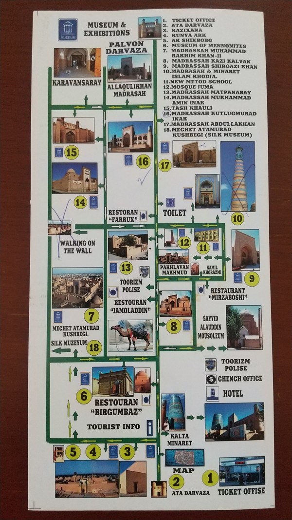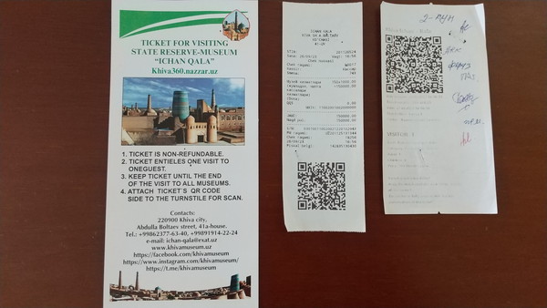 西門を見た後は、露店が賑わうメインストリートをブラブラしながら東門の方へ行ってみました。東門を撮影して、再度門を通過しようとしたところで、受付の女性に呼び止められチケットを買うように言われました。ここでようやく共通入場券(150,000スム≒約1,900円)を購入です。48時間イチャン・カラに出入り可能で、16ヵ所の施設にも入ることができます。ちなみに、イチャン・カラを出入りするだけなら北門や南門を使えば入場券は必要ないようです。レシートがチケットになっていて、QRコードをかざすとゲートに入れる仕組みです。ここでようやくまともな地図が入手できて、どこに何があるのかが少し分かってきました。