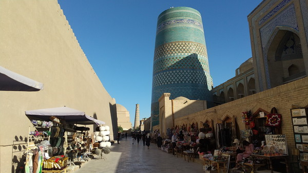 ホテルで休憩後、イチャン・カラを見て回ります。周囲は同じような建物ばかりでどっちが東でどっちが西なのかもわからない状況です。メインストリートに出ると、ヒヴァのシンボルとも言える、青のミナレット、「カルタ・ミノル」が見えました。これを見るために、はるばるここまで来たと思うと感慨深くなります。メインストリートは観光地化されてしまっていますが、中世のオアシス都市の雰囲気が出ていて、がぜんテンションが上がってきます。