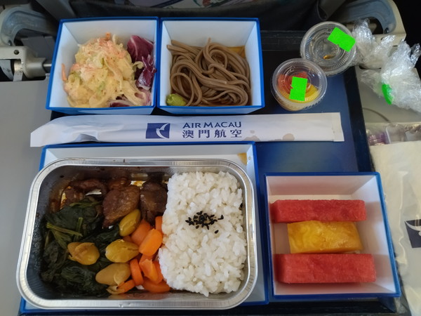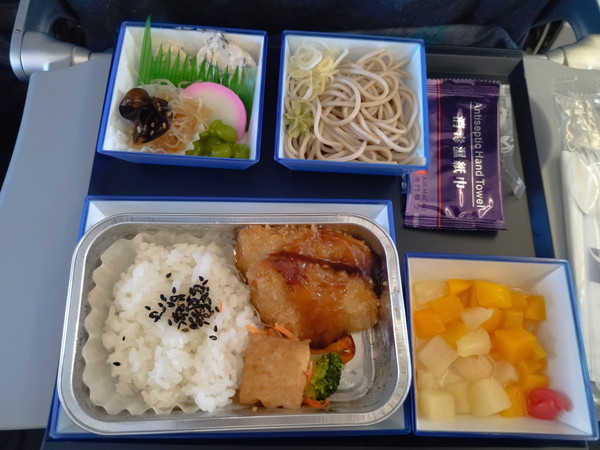 安い航空券なので、機内食ついては期待していなかったのですが、普通に美味しかったです。主菜は、揚げ物で甘めのソースで味付けされていました。その他、サラダ、蕎麦、フルーツが付いてきました。飲み物は、アルコールは無く、コーヒーやお茶、ジュースから選ぶことができました。