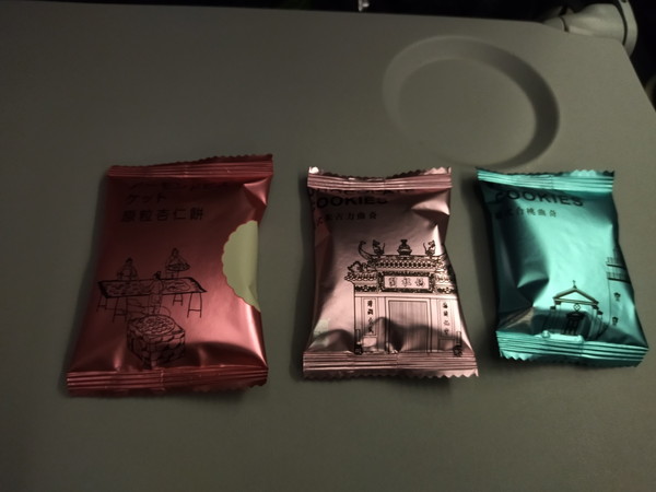離陸後間もなく、お菓子が入った箱とミネラルウォーターが配られました。空港では水を飲む時間も無くて喉が渇いており、小腹も空いていたので助かります。箱の中には3種類のクッキーが入っていました。黒と白のクッキーは至って普通のクッキーで、残りの1つはアーモンドが入った落雁のような食感のお菓子で、これは私好みだったので印象に残っています。