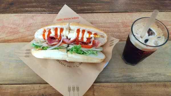 メニューは日本語も併記されているので分かりやすかったです。バインミーのトッピングはチキンをはじめ心惹かれる選択肢が多かったのですが、看板メニューのBANH MI JJを注文しました。ベーコンにハムと卵、ソースはマヨネーズとチリ―ソースという内容です。バインミーは7.8万ドン(約450円)、アイスコーヒーが4万ドン(約230円)でした。