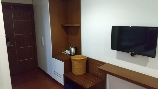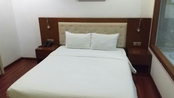 今回予約したのは7階にあるスタンダードダブルルームで、料金は一泊朝食無しで約1,500円です。今回のベトナム旅行で一番安いホテルでした。部屋は若干の古さを感じる木造建築ですが、2人利用でも十分な広さがあり、エアコン、湯沸かし器、冷蔵庫などの設備は一通り揃っています。部屋の出入りはカード方式です。