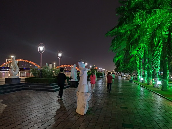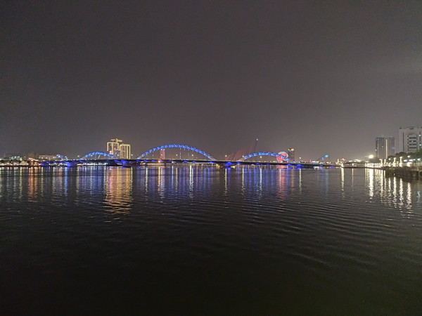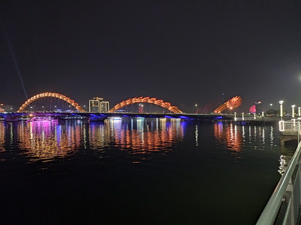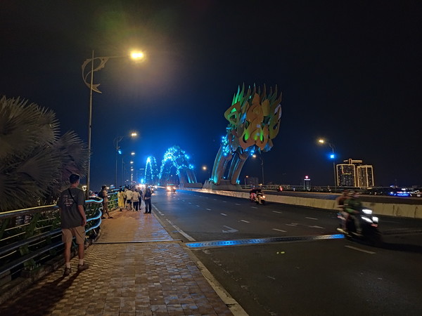 21時にロン橋のたもとに来たのですが、ショーが始まる気配たありません。どうやら、橋の向こう側(東側)は賑わっている様子、ショーは私のいる私のいる西側ではなく東側で行われるのが分かりました。まあ、事前にちゃんと調べなかった私が悪いので仕方ありません。ただし、ライトアップされたドラゴンブリッジの景観は十分楽しめたので満足しました。