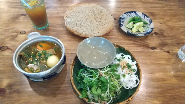 店員さんは外国人観光客慣れしているようで、スムーズに注文できました。看板メニューと思われるミークアンのセットを注文しました。麺が5万ドンで、これにスープ、パンケーキ(揚げ煎餅)、トッピング用の野菜が付いて、合計14.1万ドン(約830円)でした。ただし、メニューの内容を良く読まないまま頼んだのが、スープにカエルが入っているものでした。さすがに店員さんは心配になったのか、わざわざ再確認してくれたので、気づいてオーソドックスなものに変えてもらうことができました。あと、1点腑に落ちない点があって、間違いなくミークアンを注文したと思うのですが、レシートを見ると、麺の表記はカオラウと書いてありました。カオラウはホイアンのローカルフードである麺料理の名前です。実はカオラウとミークアンは同じ麺料理を指しており、場所によって呼び名が違うのだろうか?なんて考えたりしましたが良く分かりませんでした。