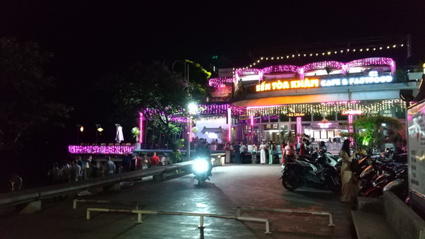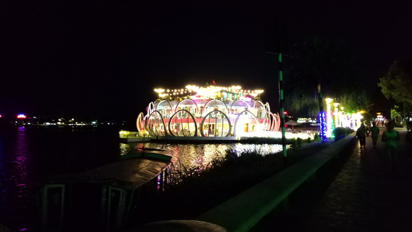 遊歩道を東に向かって歩いていると、途中で出島のような場所があり、一際明るく光っている建物がありました。Googleマップによると「Song Huong Floating Restaurant」というレストランで、フォン川を眺めながら食事を楽しめるお店のようです。