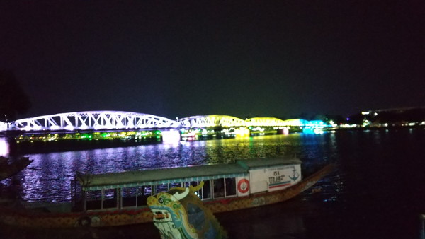フォン川の近くに来ると、チューンティエン橋のライトアップを見ることができました。数秒毎に青や赤、緑などの色に変わり見応えがありました。