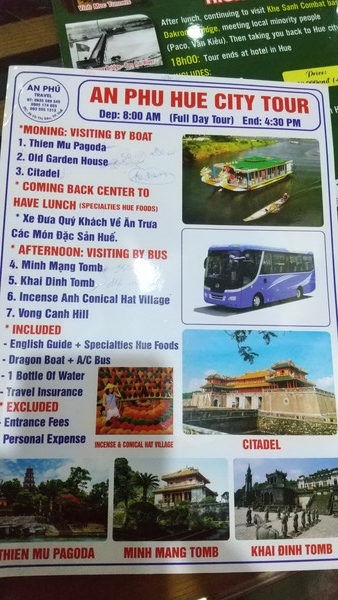 フエの観光名所と言えば、グエン朝王宮がダントツに有名ですが、郊外にあるカイディン帝陵などにも行きたいと考えていました。当初は、17日(1日目)はグエン朝王宮などの市内を観光して、18日(2日目)は郊外に足を運ぶ想定でいたのですが、先に書いた通り体調を崩してしまい計画が崩れます。実質1日しか観光できなくなってしまったわけですが、これらを自力で1日で回るのは時間的にも体力的にも厳しいと思ったので、ホテルに紹介してもらった現地ツアー「1 Day City Tour」を利用しました。午前中はグエン朝王宮、ティエンムー寺、古い庭園のある邸宅を観光、新市街のレストランで昼食を取り、午後からミンマン帝陵、カイディン帝陵、線香の村、Vong Canh Hillを観光します。移動の一部には観光船によるリバークルーズも入っています。以上の内容で、料金は昼食付で25万ドン(約1,600円)です。ただし、各施設の入場料47万ドン(約3,000円)は別料金となります。ネットの予約サイト経由で申し込むと6,000円~8,000円が相場なのでかなりお得です。ホテル経由での申請なので、ピックアップ等で問題が起きればスタッフの方が対応してくれますし、いい事ずくめです。これまでのようにあまり事前に準備をし過ぎず、多少行き当たりばったりの出たとこ勝負で観光するのも悪くないと感じました。