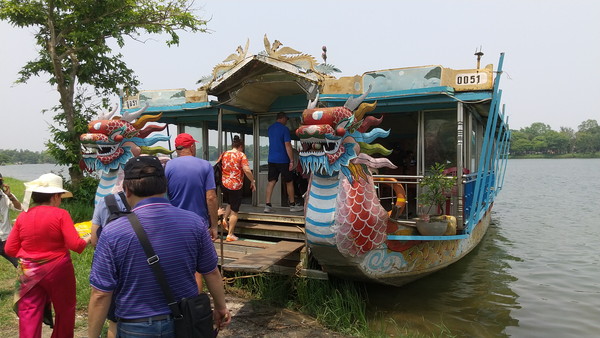 王宮を出た後は、バスで新市街側にあるボート乗り場まで移動しました。次の観光名所であるティエンムー寺までは、観光船によるリバークルーズを楽しみながらの移動となります。ティエンム―寺は王宮からフォン川に沿って西に約4.5km行った場所にあります。
