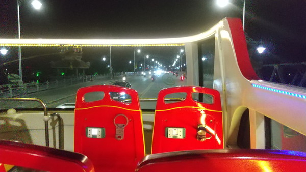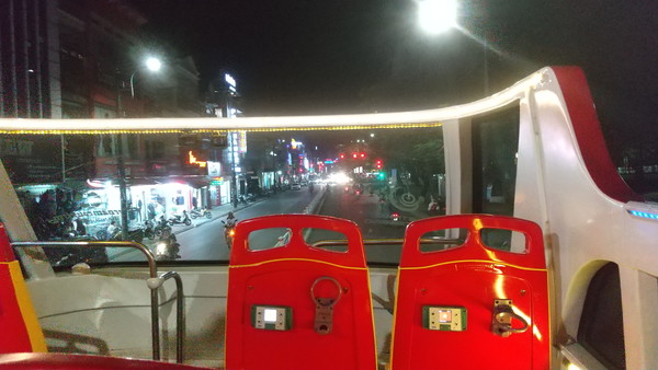 私が乗った便の乗客はどうやら私だけで、発車時刻の19時10分になっても全然お客さんが増える様子はありません。さすがに乗客1人で出発するのは嫌だったようで、女性スタッフがやって来て出発が遅れることを知らされます。結局、この後も追加で乗車するお客さんはおらず1人貸し切り状態で出発しました。日中もこんなに空いているのかは分からないのですが、フエのオープントップバスは知名度がまだまだのようなので、お客さんを集めるのに苦労している印象を受けました。