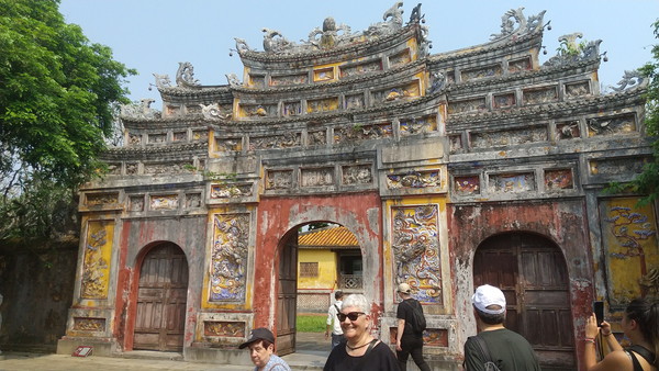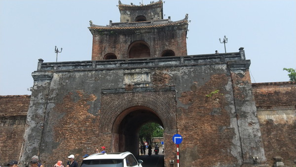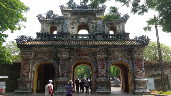ホテル前の細い道を出た通りには大きな観光バスが停まっていて、これに乗車しました。バスの中は空調が効いており、気温は大分高くなっていたので助かりました。この後、1件1件ホテルを回りながら参加者をピックアップして最終的にバスは満席となりました。欧米からの観光客が多く、アジアからの観光客は小数でした。南米から来たと思われる観光客もいて、国際色豊かな雰囲気でした。ピックアップを終えた後は、最初の観光名所であるグエン朝王宮に向かいます。この間、ガイドさんにチケット代の47万ドン(約3,000円)を払いました。