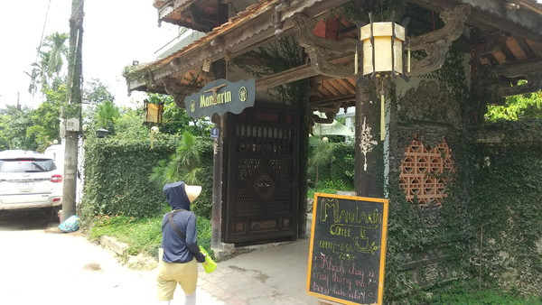 旧市街の王宮周辺には、グエン朝時代の官吏や貴族が住んでいた邸宅が点在しています。今回のツアーでは、ティエンムー寺から800mほどフエ中心部に戻ったところにある邸宅を見学しました。こちらの邸宅では、「Mandarin Coffee & Restaurant」というお店が営業していました。
