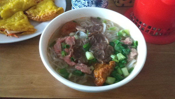 フエで一度は食べたいと思っていたのがブン・ボ―・フエです。フエで生まれた麺料理で、フォーとの違いとして細麺が特徴です。牛肉ベースのスープは私好みの薄味で、麺はそうめんに近い食感で食べ易かったです。
