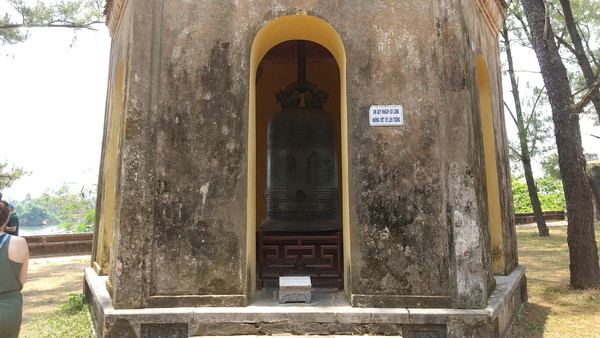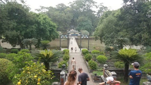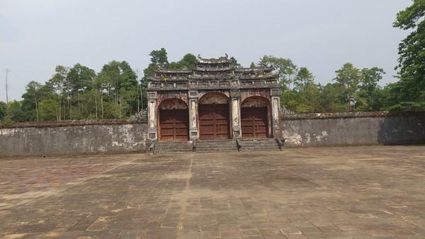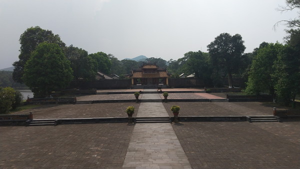 午後からフエの郊外にある観光名所を巡ります。まず向かったのがフエ中心部から約13kmほど南に行ったところのミンマン帝陵です。フォン川沿いの小高い場所にあります。第2代皇帝ミンマン帝(帝明命帝)の陵墓となります。1840年から3年かけて建設されました。ミンマン帝は西洋文化を嫌い、中国文化、儒教的思想を重視していたため、陵墓は中国のものを参考にして造られています。ミンマン帝はキリスト教の弾圧や宣教師の処刑をしたため、後のフランスによる植民地支配のきっかけと作ったと言われています。