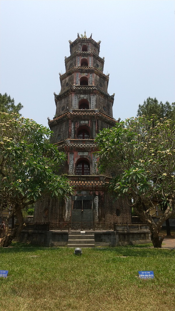 フエには300を超える寺院がありますが、その中でも最も古くて美しいのがティエンムー寺です。創建は1601年です。漢字で書くと「天姥寺」となります。
