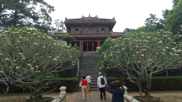 ここでガイドさんは当時の結婚制度やら慣習について説明していたのですが、イマイチ理解できませんでした。この辺の景観は大変良かったのですが、これに加えて通りに沿って植えられている、白い花が咲いている植物が景観に大変マッチしていたのも印象に残っています。この植物についてはガイドさんに聞いてみたところ、Champa Flower(チャンパの花)だと教えてくれました。後で調べたところ、チャンパの人々の象徴的な植物だそうです。植物に詳しくないので合っているか分かりませんが、日本ではプルメリアと呼ばれているそうで、暑い気候の中で育つようです。チャンパというのは、2世紀後半から19世紀前半までベトナム中部から南部にかけて存在した国家で、海上貿易で栄えました。インドの影響を強く受けたためベトナム北部とは色彩が異なる文化が発展しました。このよう感じで、東洋(中国)と西洋(フランス)だけなく、チャンパの影響も垣間見ることができることも、フエを観光していて面白いと感じた部分です。