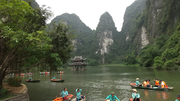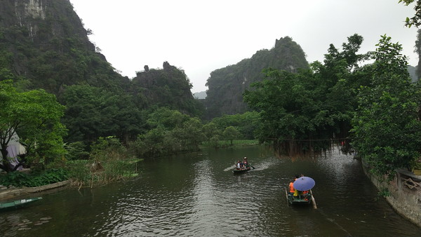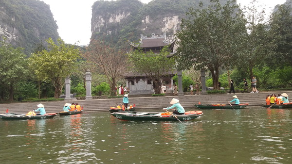 チャンアンのクルーズは3つのコースがあり、それぞれ異なる洞窟や寺院を回ります。時間は2時間半~3時間です。ただし、私たちの場合、どうやらこれらとは別の、このツアー用にアレンジしたコースだったようで、コース2を省略した内容に近く、1時間半程度で終わりました。後から調べてみると、重要なポイントは網羅されているので、コンパクトながらも良いルートだったのが分かります。3時間と言っても、同じような景観が続いて途中で飽きると言及している人もチラホラいるんですよね。正直、元々ボートクルーズ自体にあまり興味がなかったこともあり、3時間もボートに乗っているのは大変だなぁと考えていたので、個人的にはこの内容で満足でした。ガイドさん曰く、このツアーの内容で1日で回るにはチャンアンの時間を減らすしかないということです。私は納得したのですが、事前の説明とは違っていたこともあり、何人かの観光客は不満を言っていました。