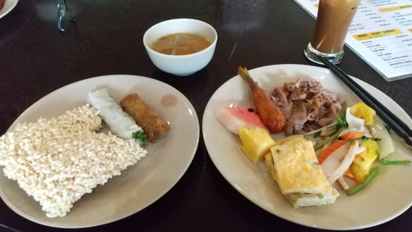 こちらではビュッフェ形式で昼食が頂けるようですが、お店側の準備がまだのようだったので、とりあえずアイスコーヒーを注文して時間を潰します。間もなくすると、食事ができるようになりました。メニューはベトナム料理から洋食まで多彩なラインナップでした。