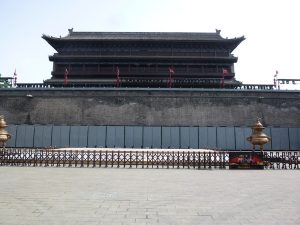 闕楼を抜けると、箭楼があり、前には太鼓と日時計が置いてあります。「箭」は日本語で「矢」を意味し、矢を射る窓があります。闕楼を突破した敵に矢を射るわけですね。箭楼には門がないため、左右を迂回する必要があります。敵が簡単に突破できないような工夫がされています。