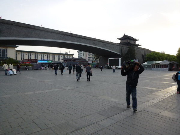 朝7時から運行しているという情報を得ていたので、6時半頃にホテルを出て西安駅に向かいます。歩いて2,3分で城壁が見えてきますので下をくぐります。