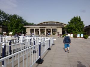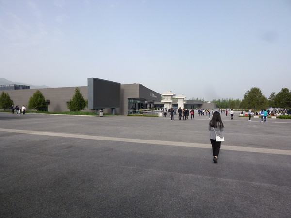 途中、城壁や建築中の高層ビルを見るなど西安の景観を楽しみます。また、車両が古いのか整備が行き届いていないのか分かりませんが、クラッチが繋がらなくなりしばらくバスが動かないトラブルにも見舞われますが、約70分後、何とか「秦始皇帝陵博物院」の駐車場に到着しました。そこからしばらく歩き、「售票处(チケット売り場)」という標識を追っていくとチケット売り場の建物が見えてきます。