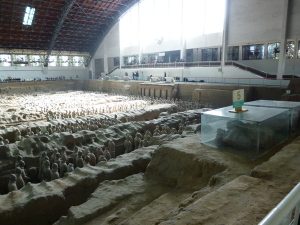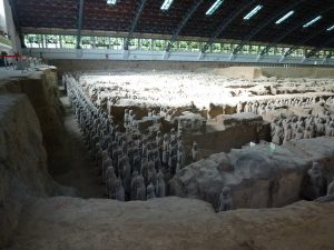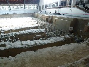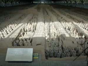 兵馬俑は、秦の始皇帝が埋葬された陵墓のほど近くに副葬された兵士および馬を形どった彫刻です。「俑」は使者と一緒に埋葬する人形を意味します。1974年に井戸を掘ろうとした農民により発見されました。20世紀最大の発見とも言われている世界遺産です。