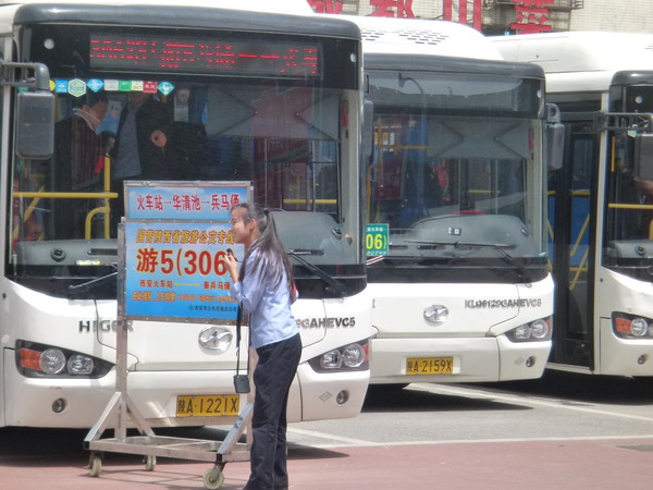 広場に着いたのは6時45分ぐらいだったのですが、既に青色のバスが停まっており、係員の女性が観光客に声を掛けていました。係員の方が「ビンマーヨウ(兵馬俑の中国語読み)」と叫んでおり、バスの正面には「遊5(306)」という看板も見えましたので、これが周遊バスだと判断し乗り込みました。バスが出発してしばらくすると、運賃として一人7元を徴収されます。